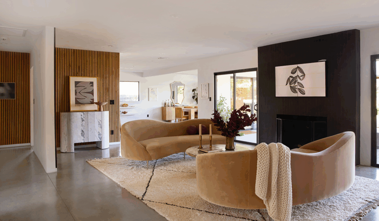 This 5 bed, 5 bath epitomizes a rustic-yet-refined energy with exposed wood beams, steel framed windows, and natural stone. Sunlight fills the living space, while the chef’s kitchen and dining room invite effortless gatherings. The primary wing feels like an escape, complete with a freestanding tub and rain shower. With interior design by Amber Interiors – every little detail is considered: from sophisticated materials to bespoke furnishings. In addition, a private casita offers extra room for guests and a gym.
